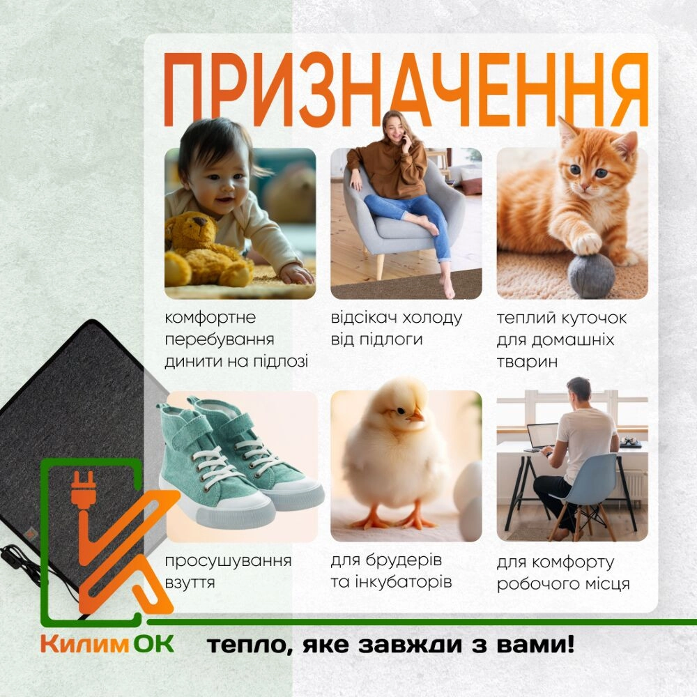 Автономна робота від мережі 220 В, рівномірне нагрівання та вологозахищене покриття килимка роблять його безпечним та корисним для щоденного використання.